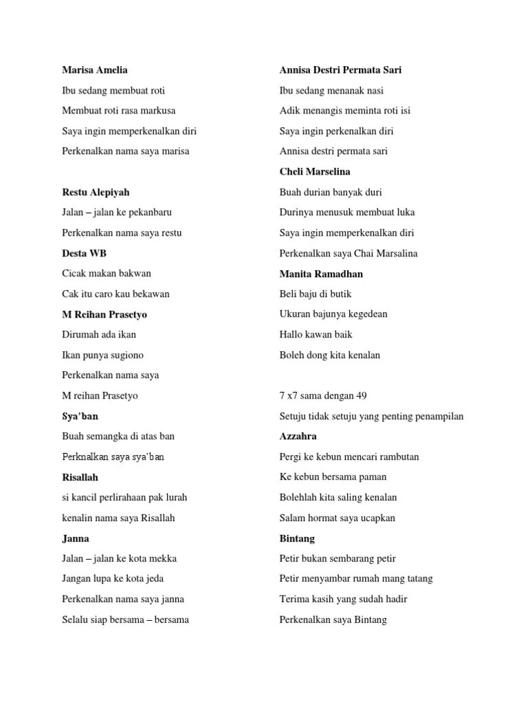 Apabila ingin menggunakan jenis pantun ini untuk memperkenalkan diri kepada orang banyak, maka alangkah lebih . Kumpulan pantun perkenalan diri yang lucu dan tidak membosankan, bisa disampaikan di momen perkenalan siswa baru di kelas. Memperkenalkan diri menggunakan pantun dapat membuat suasana menjadi cair jika dilakukan dengan benar. Ketika bertemu dengan orang baru, seseorang pasti akan mengawali sebuah percakapan dengan memperkenalkan diri terlebih dahulu. 10 contoh pantun perkenalan nama di depan kelas ketika berbicara di depan orang . Pohon sukun di tengah taman · 2.